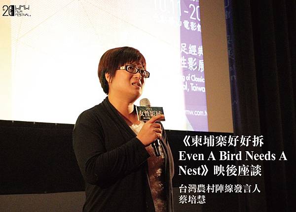 蔡:女影已經二十年了,從前探討的都是女性身體的解放與認同,何春蕤教授還曾經打出“只要性高潮不要性騷擾”的口號。作為女性我們從影片中可以看到,我們是可以共同面對發展的難題,在台灣來說,從樂生、大埔、士林王家及華光來看,人們被突然來的開發計畫摧毀了日常生活,柬埔寨跟台灣有相似也有不同的地方,柬埔寨是所謂在東南亞國家中最民主和開放的,但所謂的開放是對資本的開放,不論是農村土地賣給外商或是公司擴張都是相當激烈,柬埔寨是東南亞中INGO也就是國際NGO最多的國家,因為人性工作必須在那裏做,荒謬的是國家與資本的結合形成的安頓其實是指人像螻蟻一樣生活,但人們應該要在開發時站出來。我們在台灣也做了很多抵抗的行為,除了各位看到的街頭抗爭,很大的一部分是做體制的改變,但我覺得最可怕的是台灣的政府慢慢跟柬埔寨一樣拒絕與人民對話,一二年前政府面對像工人罷工與大埔類似事件時,在記者前說話協商但與我們的對話卻是擱置的,這是最可怕的,但撇除可怕的情緒,我們還必須行動,要像片中的女性很堅強相信自己可以改變,看這部片其實很沉重,這些是我的想法,那看看大家的想法是如何。